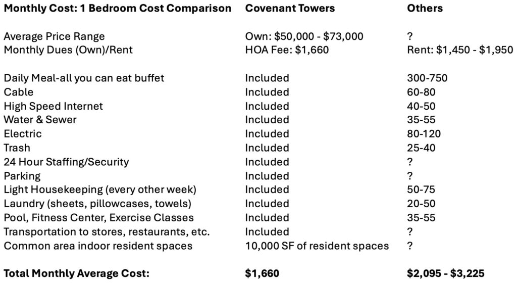 As you can see, Covenant Towers ‘all-inclusive’ approach to living takes all the guesswork out of your budgeting.  Meals, utilities, activities…we’ve thought of everything!